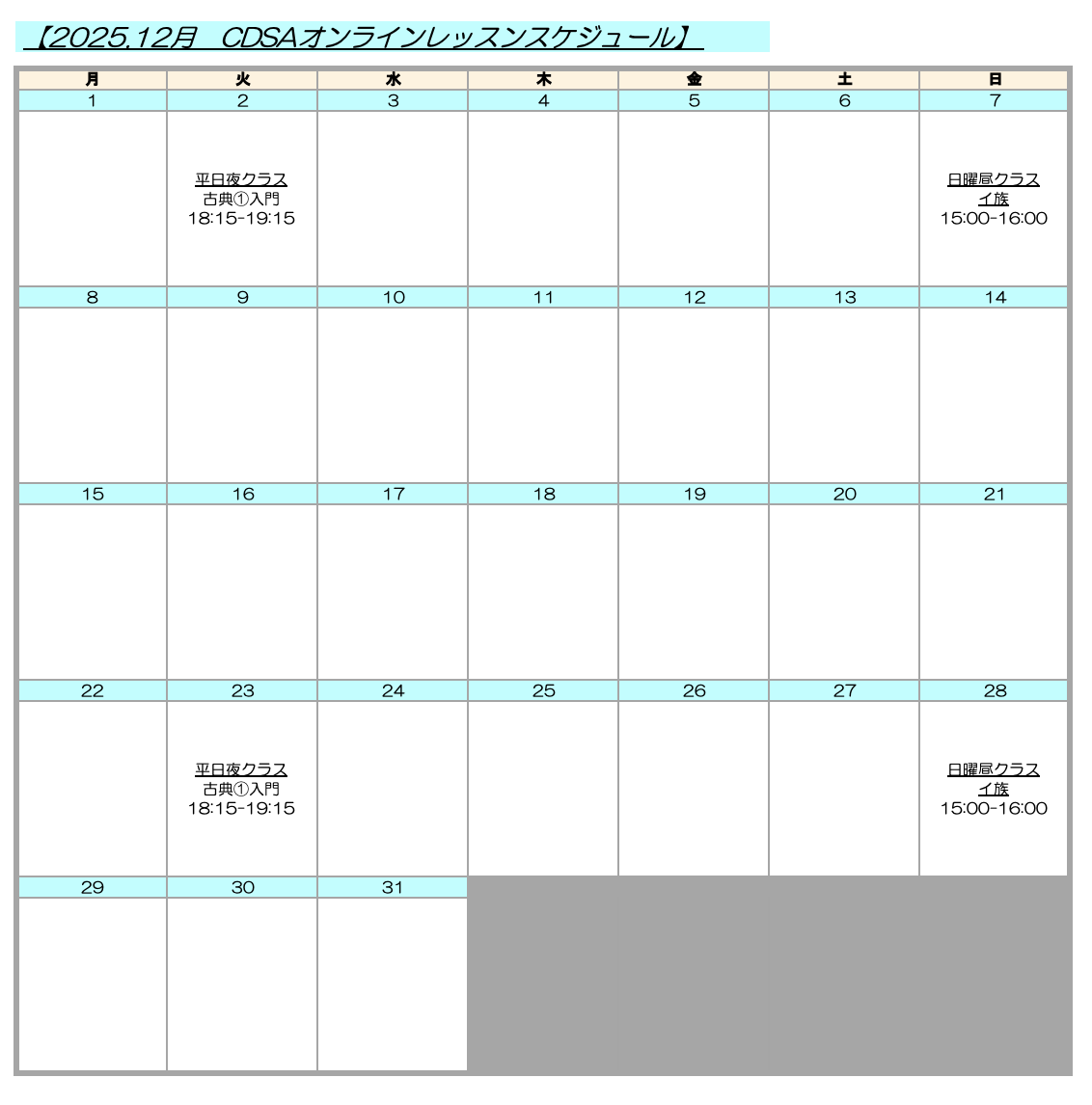◯ 日曜昼クラス イ族(15:00-16:00): 12月7日、12月28日